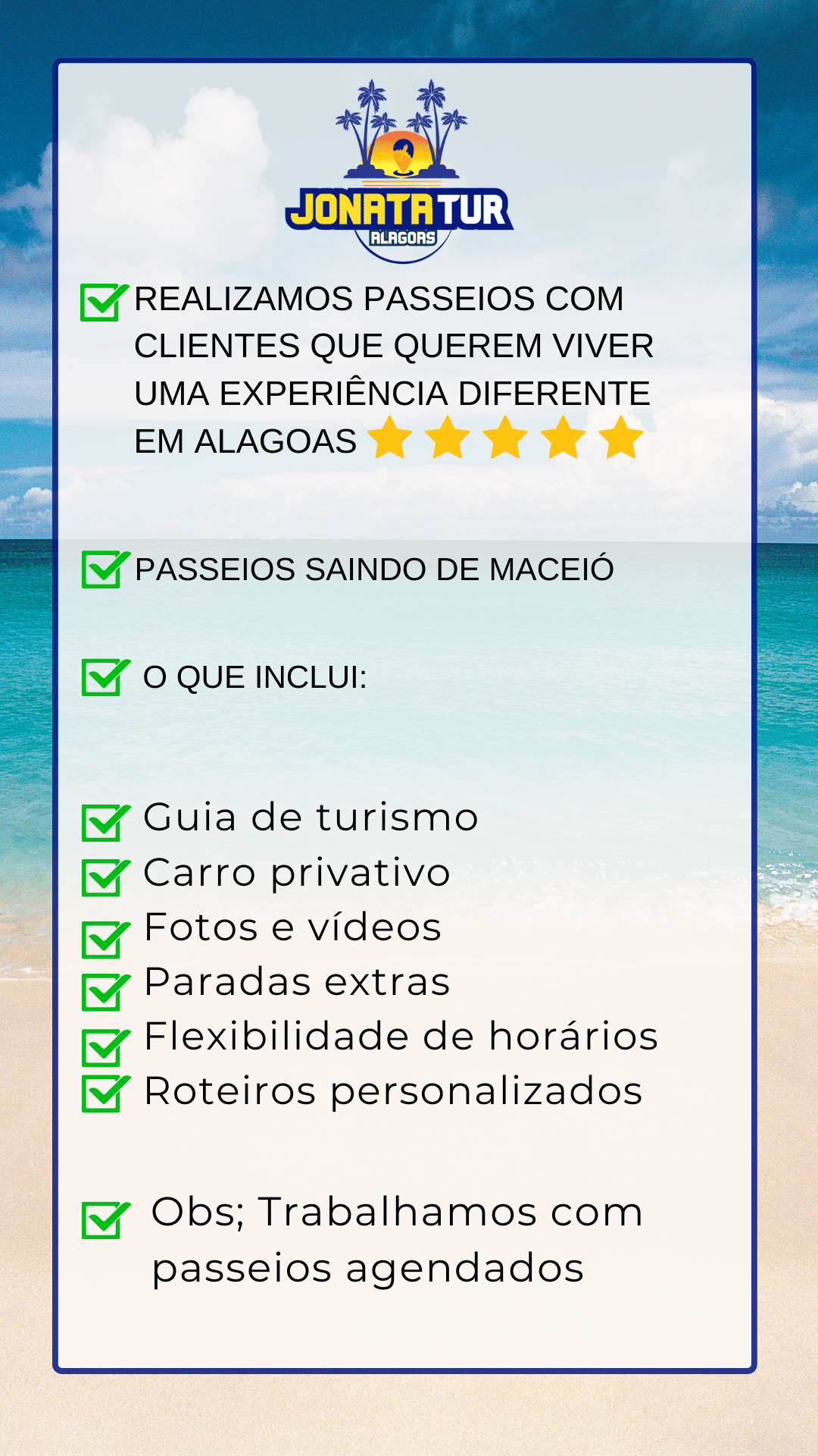 Vamos visitar os principais pontos turísticos, históricos e arquitetônicos em um passeio panorâmico divertido e cultural pelo famoso e monumental Bairro de Jaraguá, Museus, Praça Dois Leões e a bela rua dos antigos casarões da época do Brasil Imperial e a Associação Comercial, a Praça Dom Pedro II e seu entorno, a Catedral Metropolitana de Maceió; na sequência visitaremos o Mirante de São Gonçalo, o centro de Maceió, a Praça Deodoro e toda riqueza histórica ao seu redor, e finalizamos no bairro das Rendeiras no Pontal da Barra, com sua variedade de artesanatos, renda renascença, e o famoso filé alagoano.